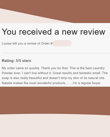 My order came so quickly. Thank you for that. This is the best Laundry Powder ever. I can't live without it. Great results and fantastic smell. The soap is also really beautiful and doesn't strip my skin of its natural oils. Natalie makes the most wonderful products........I'm a regular buyer.
